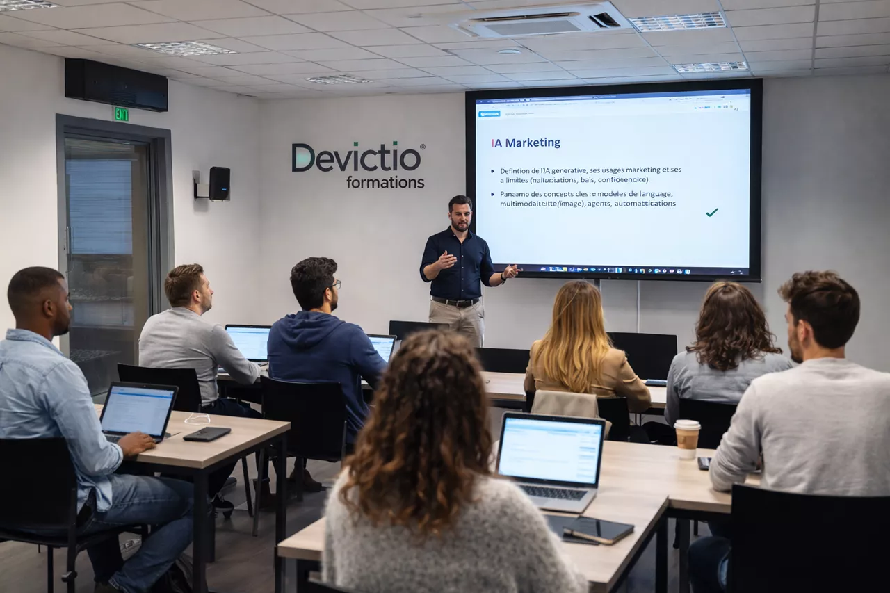 Boostez vos performances marketing grâce à notre formation IA Marketing (à suivre sur Lyon, Paris, France entière) pensée pour les professionnels qui veulent gagner du temps, produire mieux et convertir plus. Vous apprendrez à utiliser l’IA générative (ChatGPT, Gemini, Claude…) pour accélérer la création de contenus (posts, emails, landing pages), structurer une stratégie éditoriale, optimiser vos campagnes SEO/SEA, et améliorer votre community management avec des visuels impactants.